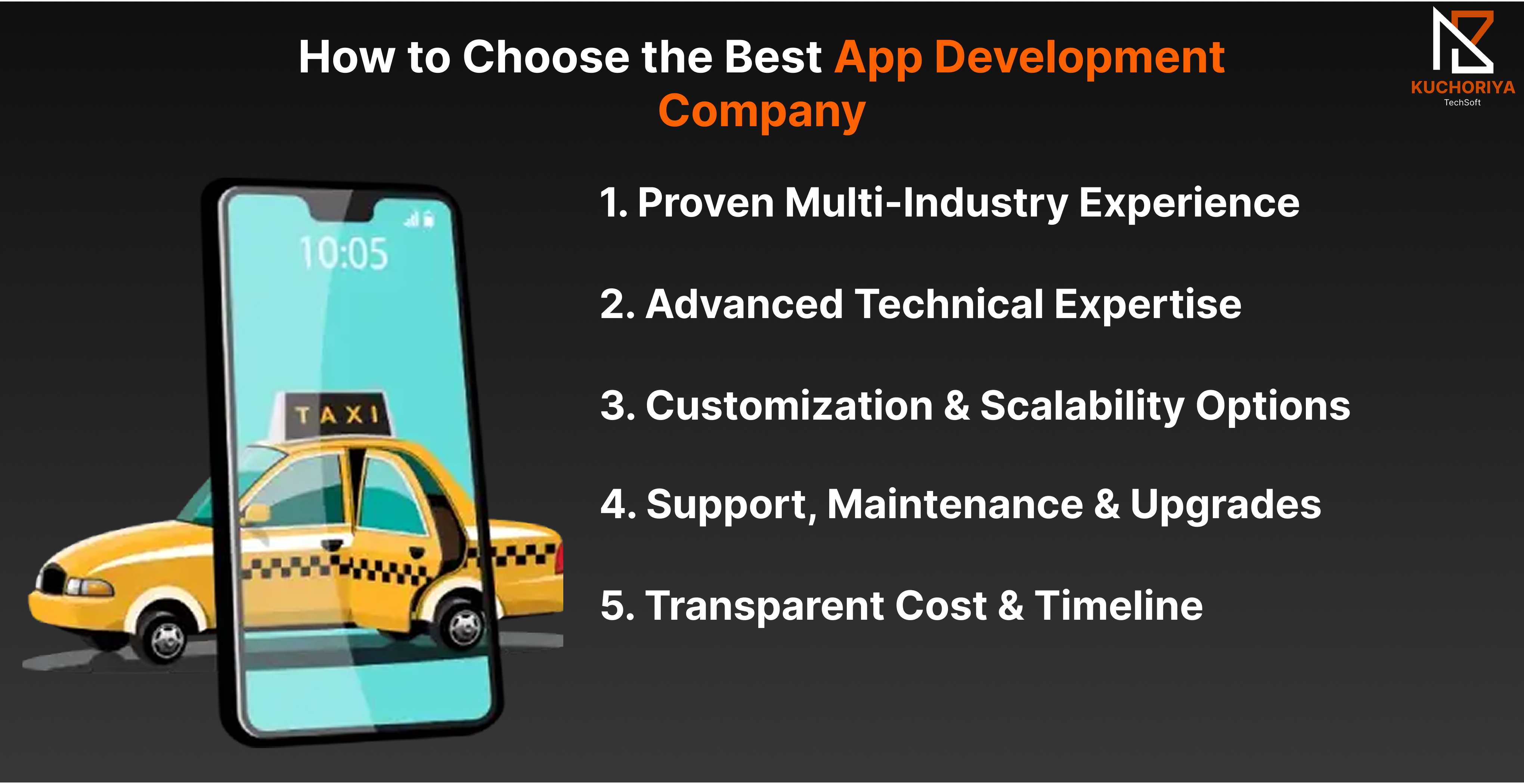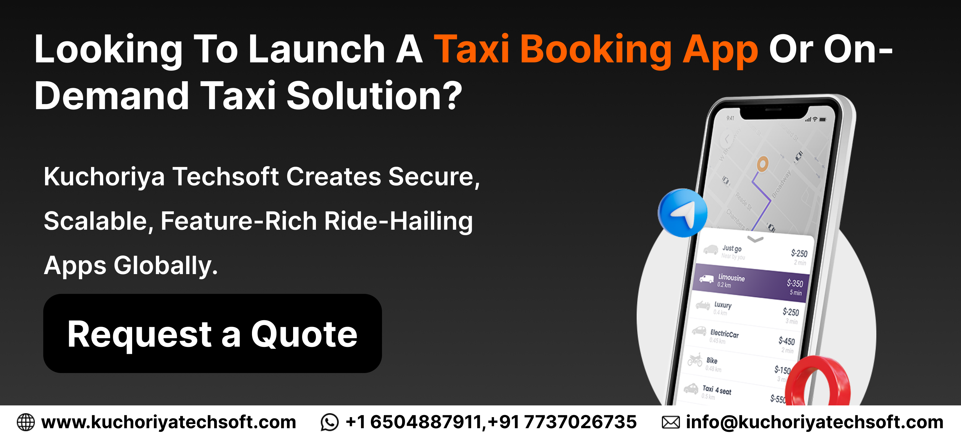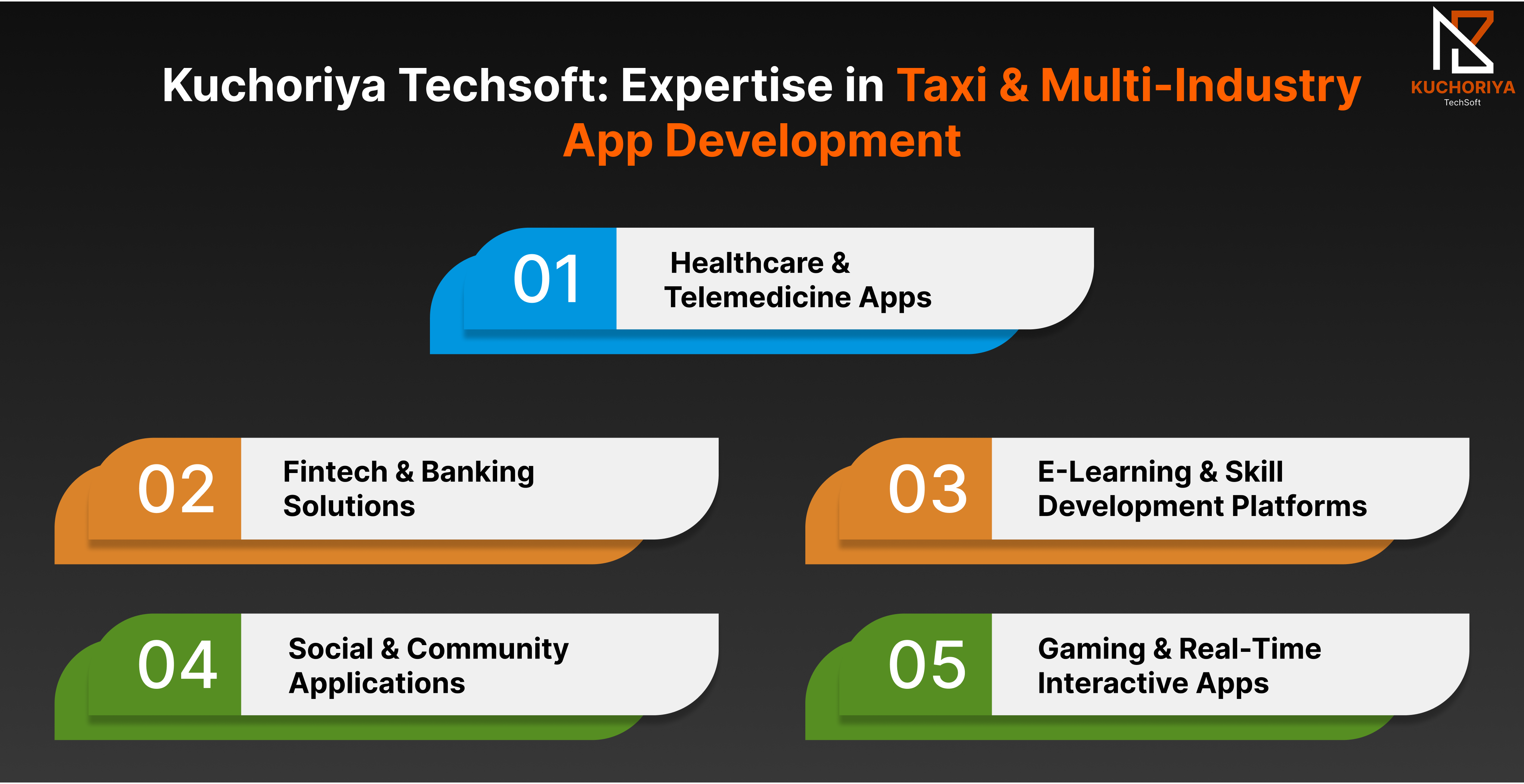 Kuchoriya Techsoft stands out as a leading technology partner for businesses seeking custom mobility and multi-industry solutions. From taxi booking apps to healthcare, fintech, e-learning, and social platforms, we provide scalable, secure, and user-friendly applications for global markets, including the USA, Canada, UK, Dubai, and Australia.